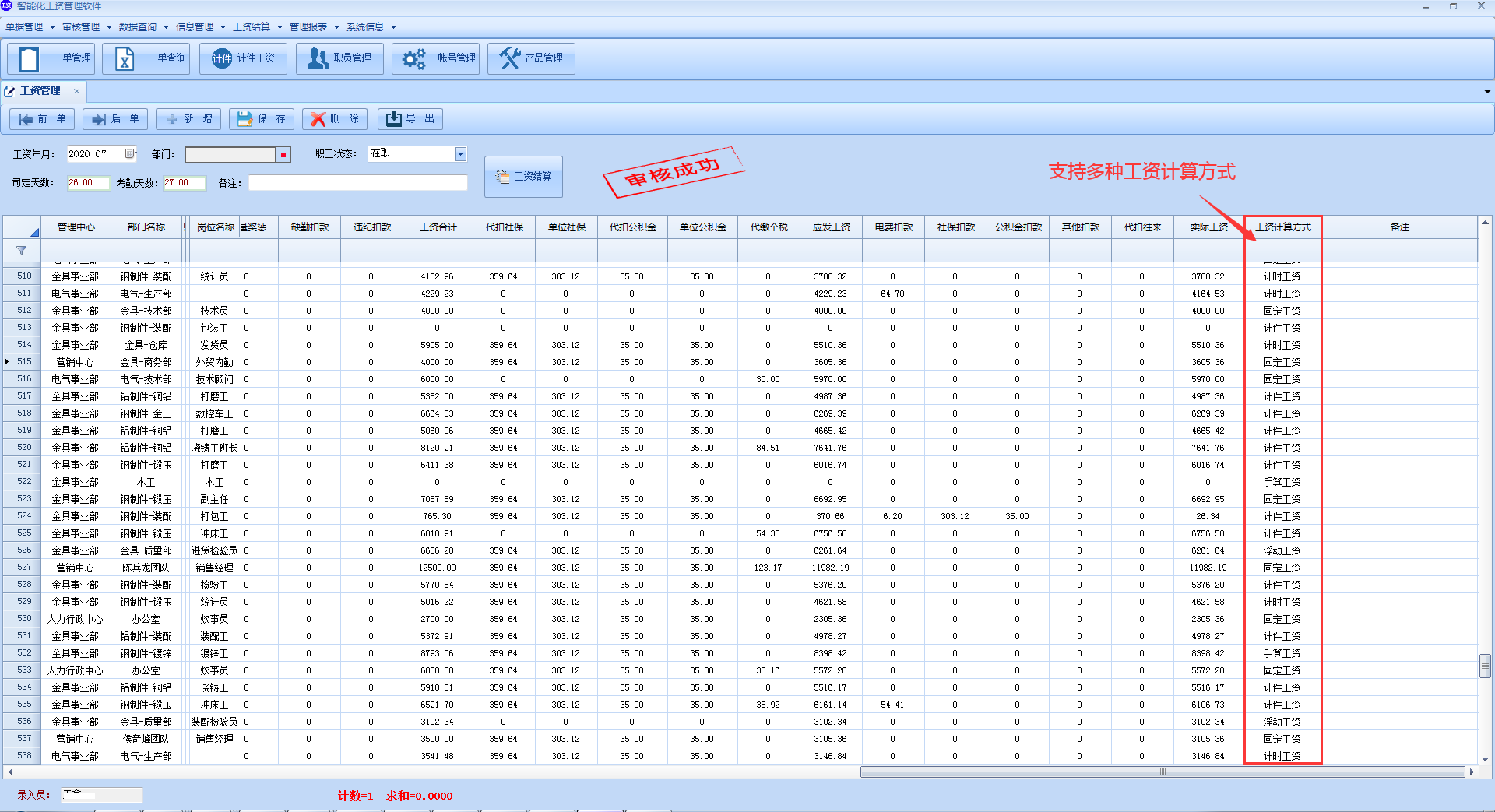 支持多種工資計算方式(計件工資、計時工資、固定工資、浮動工資、手動工資等)
