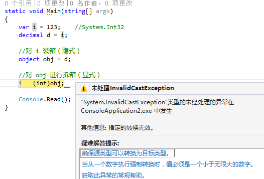 雖然,decimal 類型可以直接強轉(zhuǎn)為 int 類型,但從調(diào)式的結(jié)果來看,拆箱時是會引發(fā)“轉(zhuǎn)換無效”的異常。要記住,拆箱時強轉(zhuǎn)的值類型,應(yīng)以裝箱時的值類型一致。