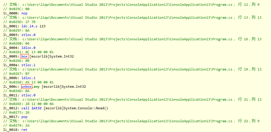 直接通過反編譯得到的 IL 代碼,從 box 和 unbox 這兩個指令也可以看出具體在哪一步發(fā)生裝箱和拆箱操作。