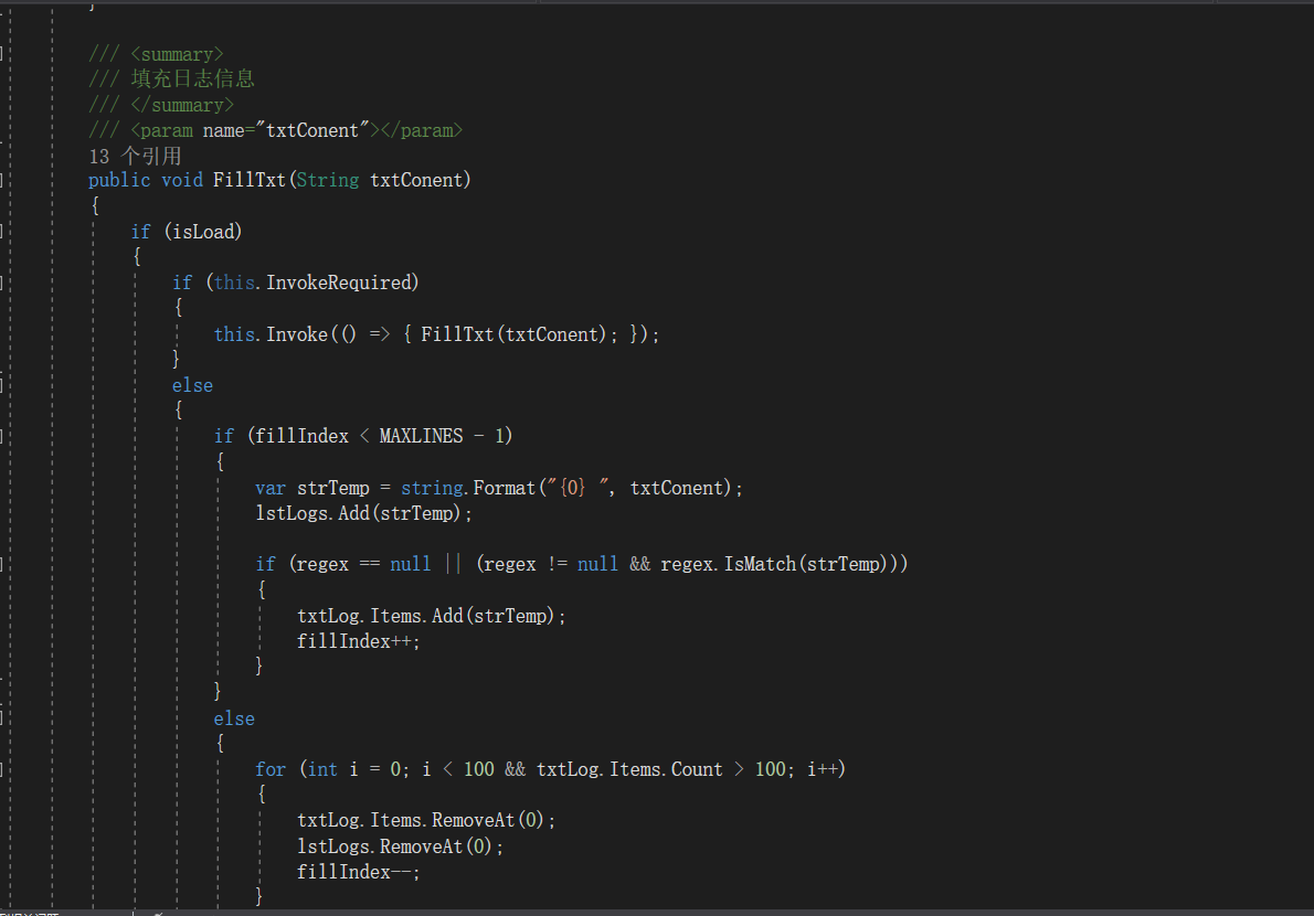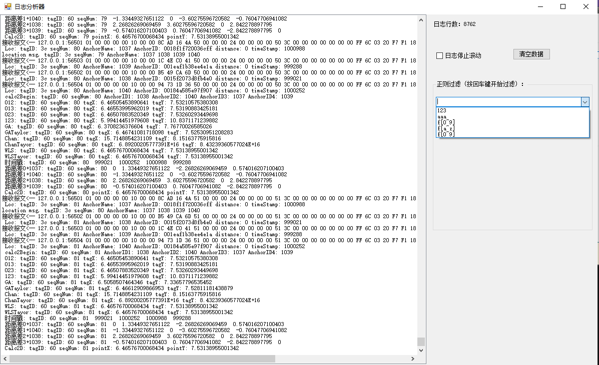 為了解決實(shí)時(shí)顯示日志與日志持久化保存的矛盾,開(kāi)發(fā)了一個(gè)日志分析器,可以在調(diào)用log4net進(jìn)行持久化操作前,加入一個(gè)窗體打印函數(shù)調(diào)用,先進(jìn)行窗體上顯示,再做持久化保存。本日志分析器另一個(gè)優(yōu)點(diǎn)是,窗體上的日志分析是支持正則表達(dá)式的,可以按任意正則條件進(jìn)行過(guò)濾。支持多次反復(fù)過(guò)濾查詢、支持日志駐停、 支持歷史查詢選項(xiàng),支持日志條數(shù)清理(超過(guò)最大日志行數(shù)將依次清除最早的100行),支持復(fù)制導(dǎo)出。