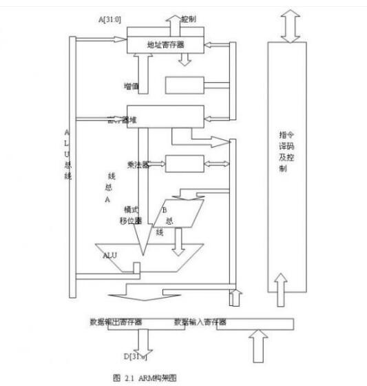 下圖所示的是ARM構(gòu)架圖。它由32位ALU、若干個(gè)32位通用寄存器以及狀態(tài)寄存器、32&TImes;8位乘法器、32&TImes;32位桶形移位寄存器、指令譯碼以及控制邏輯、指令流水線和數(shù)據(jù)/地址寄存器組成。